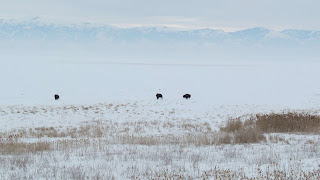 Soon I see 3 bison marching their way north along the lake's edge.